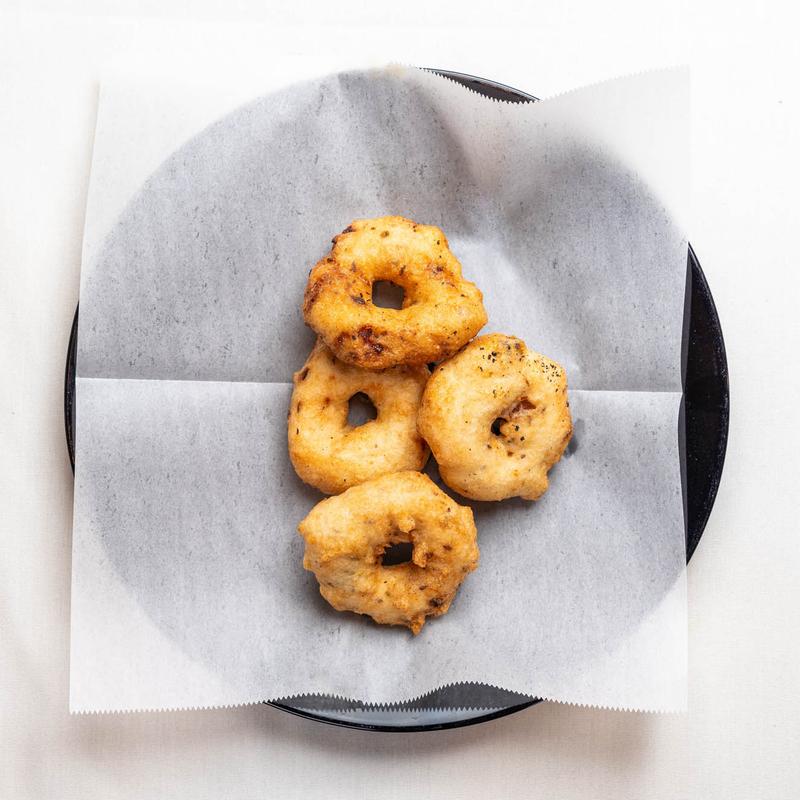A mix of thinly chopped onions mixed with gram flour, and mild Indian seasonings and deep fried