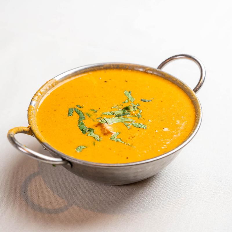 Cooked lentils lastly tempered with oil or ghee, mild Indian spices and fresh herbs